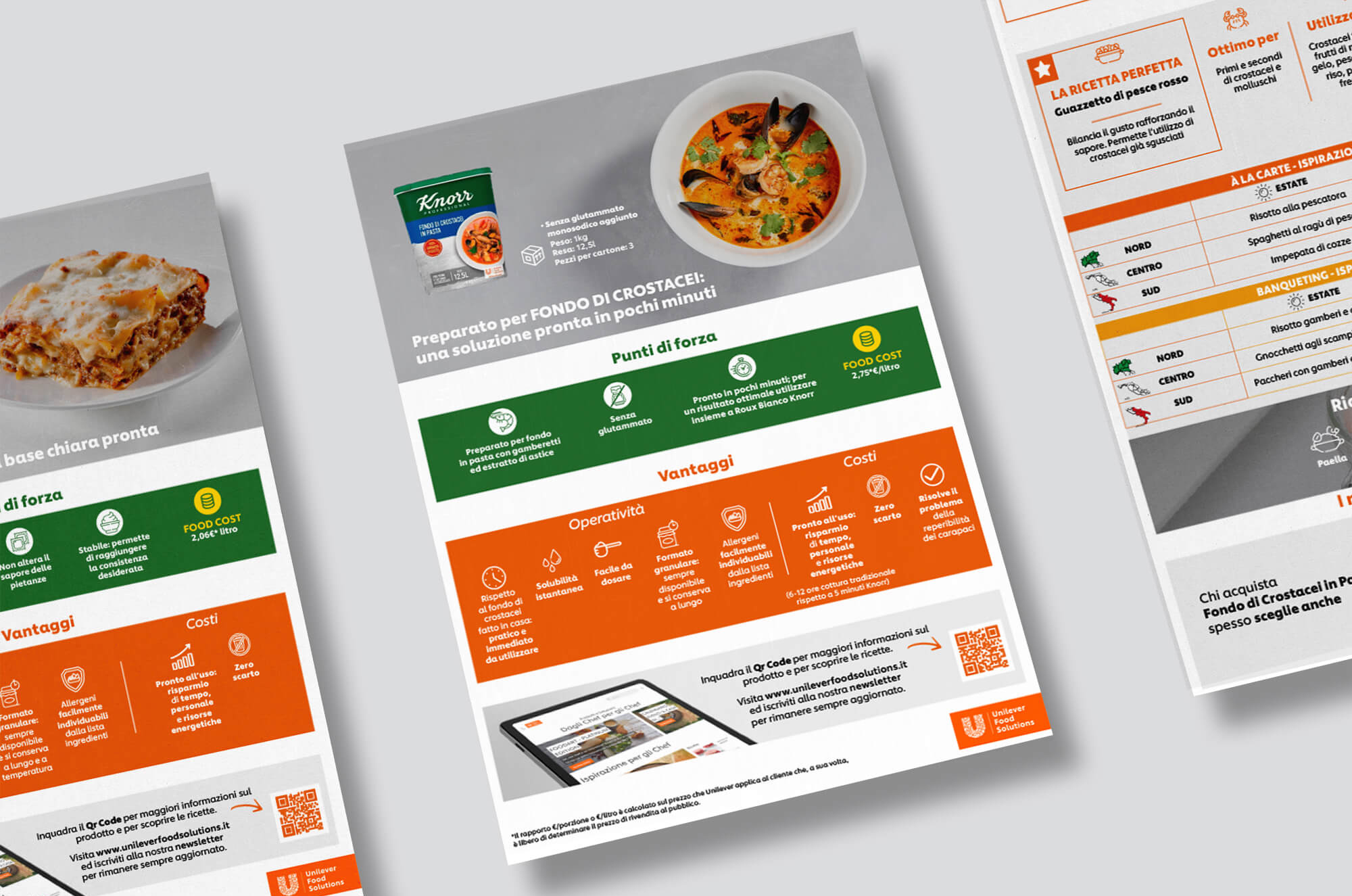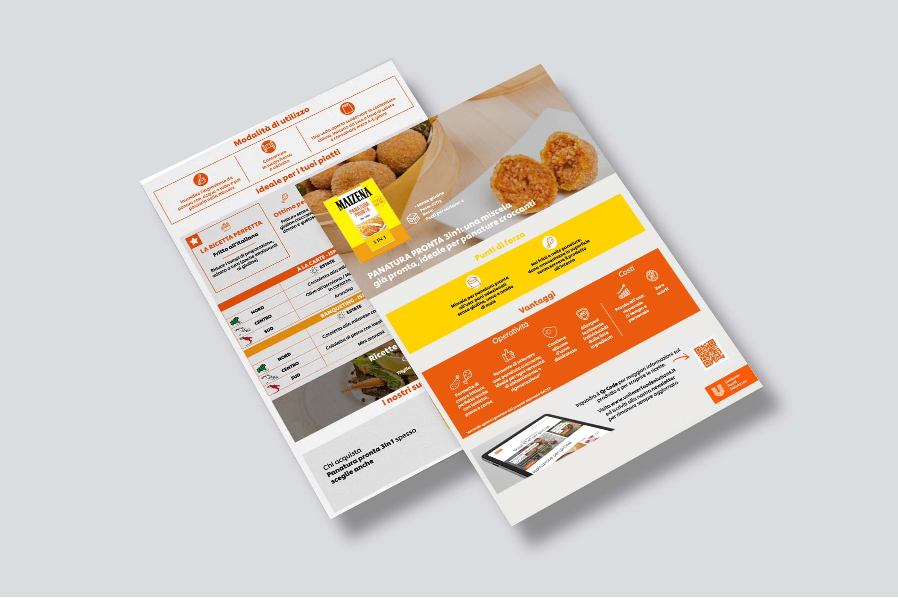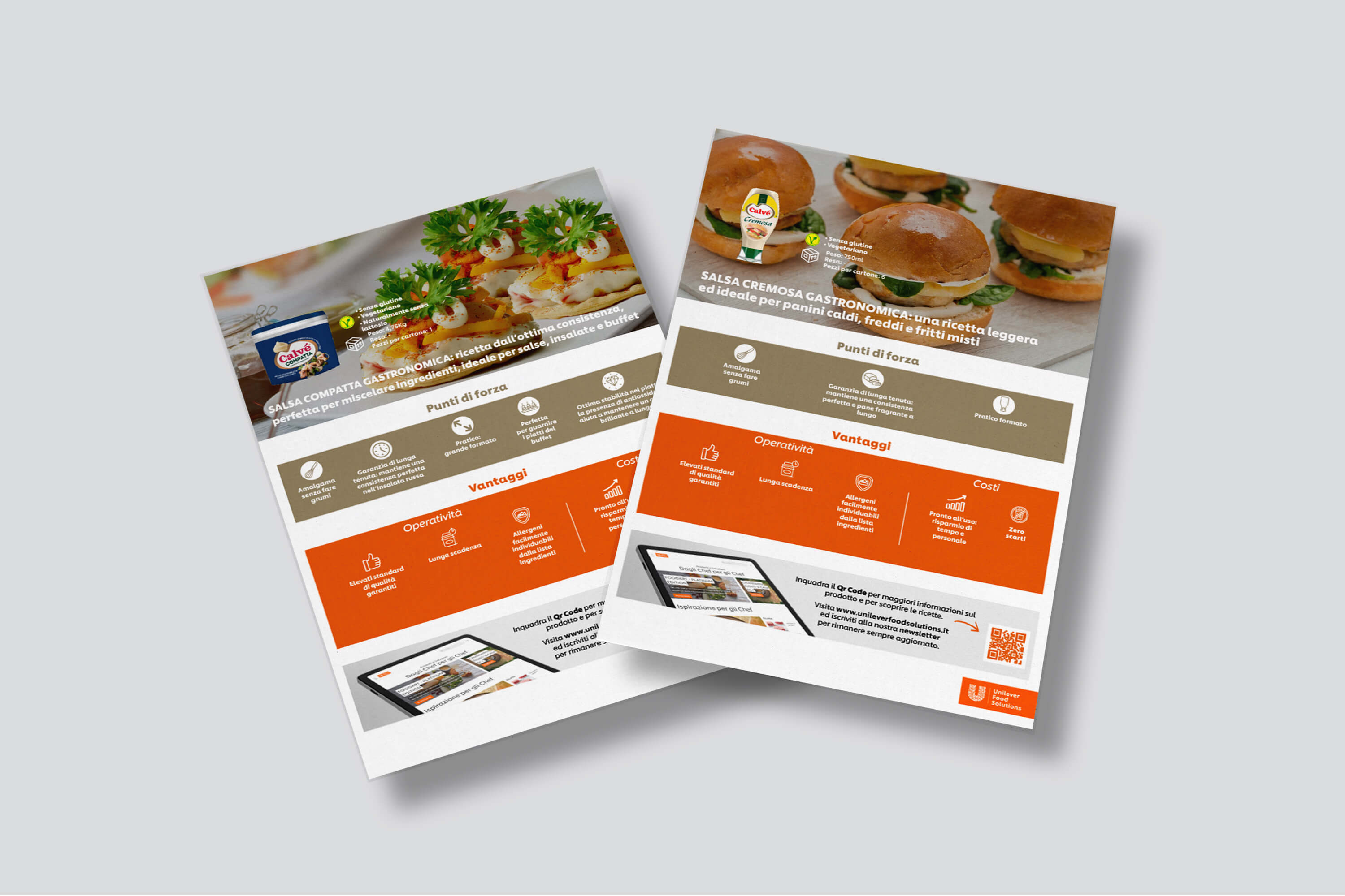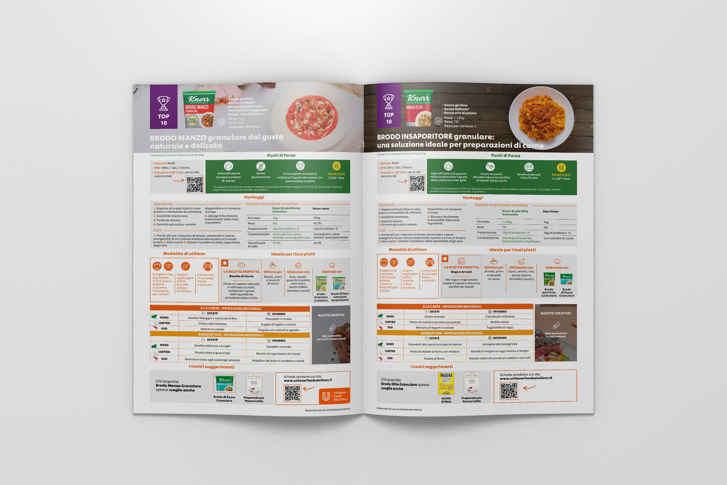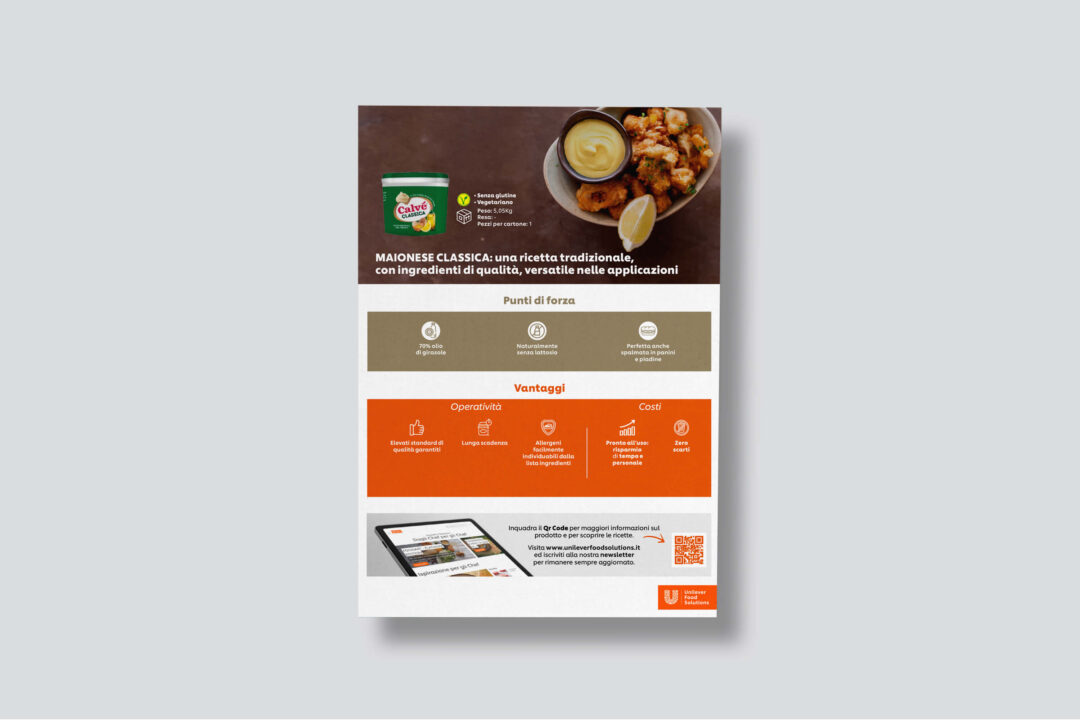Le Operation Selling Stories sono schede fronte e retro, in cui Unilever Food Solution ha la possibilità di raccontare il proprio prodotto illustrandone tutte le caratteristiche e fornendo contemporaneamente consigli d’uso. Anche in questo caso, siamo riusciti a proporre un layout grafico chiaro ed essenziale, con colori e icone in linea con il brand. Il risultato sono schede prodotto essenziali nella grafica e accattivanti nel design.